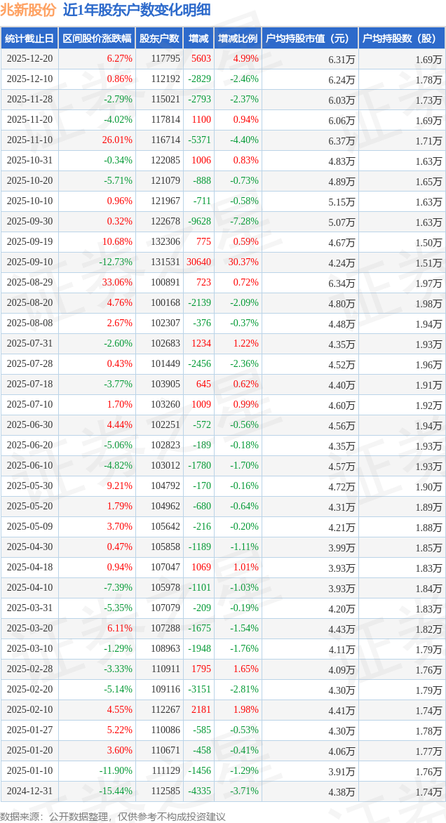从股价来看,2025年12月10日至2025年12月20日,兆新股份区间涨幅为6.27%,在此期间股东户数增加5603.0户,增幅为4.99%。