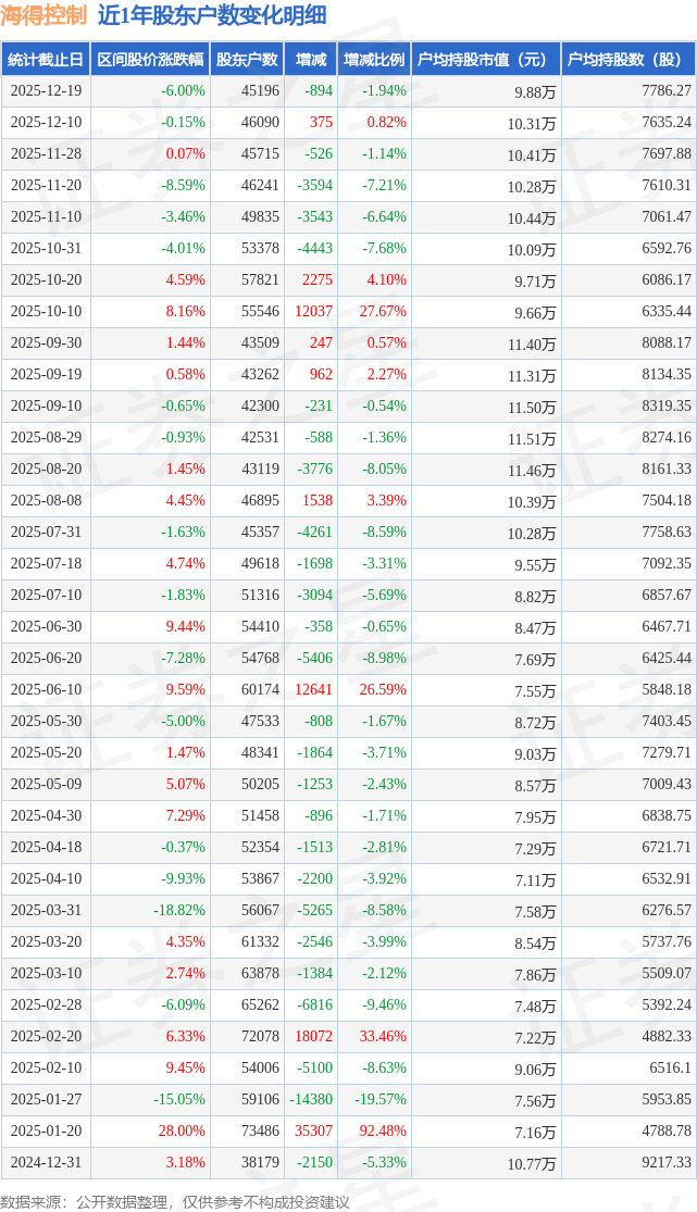 从股价来看,2025年12月10日至2025年12月19日,海得控制区间跌幅为6.0%,在此期间股东户数减少894.0户,减幅为1.94%。
