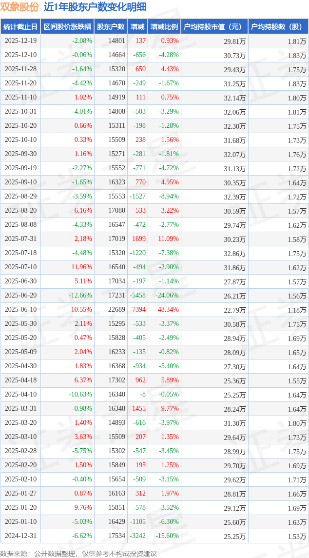 从股价来看,2025年12月10日至2025年12月19日,双象股份区间跌幅为2.08%,在此期间股东户数增加137.0户,增幅为0.93%。