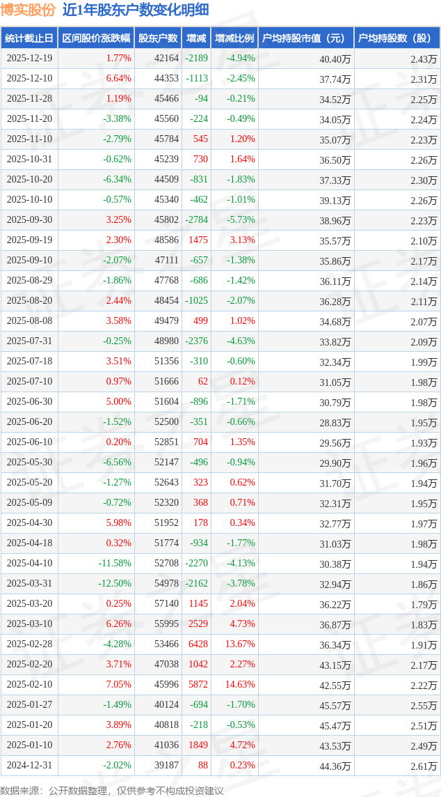 从股价来看,2025年12月10日至2025年12月19日,博实股份区间涨幅为1.77%,在此期间股东户数减少2189.0户,减幅为4.94%。