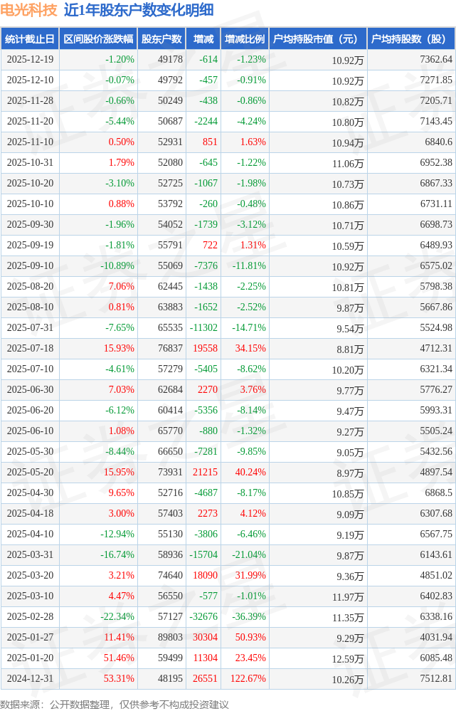 从股价来看,2025年12月10日至2025年12月19日,电光科技区间跌幅为1.2%,在此期间股东户数减少614.0户,减幅为1.23%。
