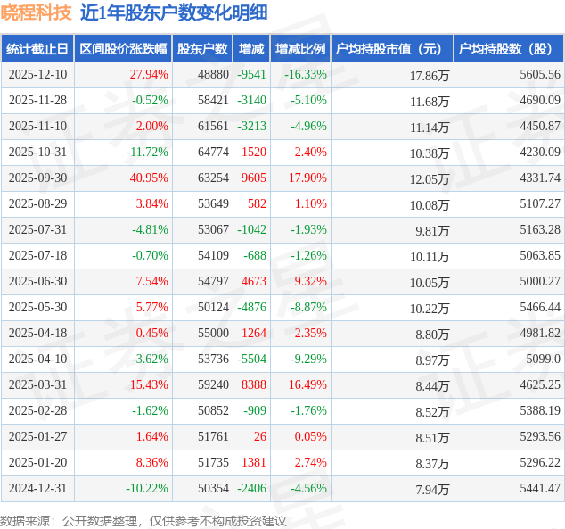 从股价来看,2025年11月28日至2025年12月10日,晓程科技区间涨幅为27.94%,在此期间股东户数减少9541.0户,减幅为16.33%。