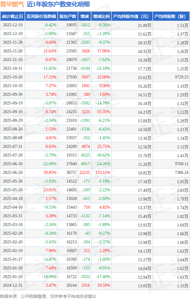 从股价来看,2025年12月10日至2025年12月19日,首华燃气区间跌幅为8.42%,在此期间股东户数减少2012.0户,减幅为9.56%。