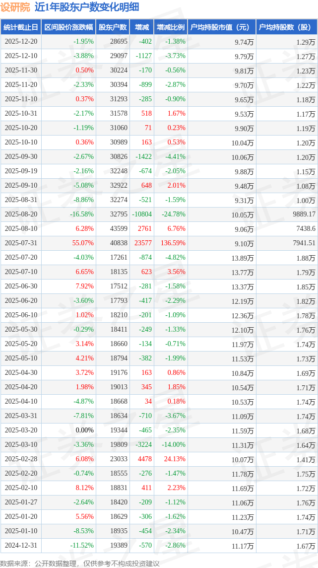 从股价来看,2025年12月10日至2025年12月20日,设研院区间跌幅为1.95%,在此期间股东户数减少402.0户,减幅为1.38%。
