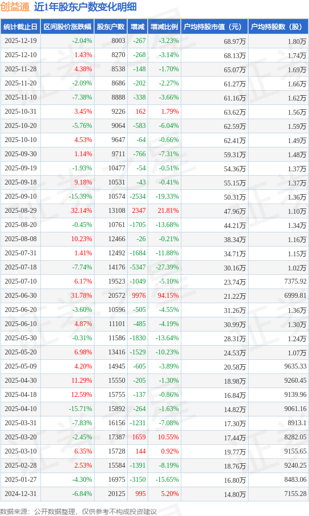 从股价来看,2025年12月10日至2025年12月19日,创益通区间跌幅为2.04%,在此期间股东户数减少267.0户,减幅为3.23%。