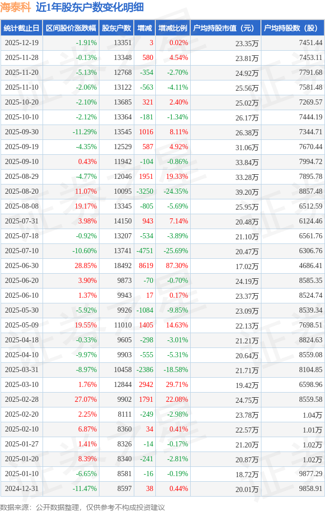 从股价来看,2025年11月28日至2025年12月19日,海泰科区间跌幅为1.91%,在此期间股东户数增加3.0户,增幅为0.02%。