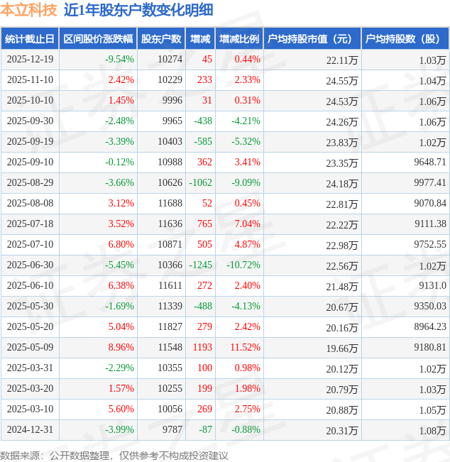 从股价来看,2025年11月10日至2025年12月19日,本立科技区间跌幅为9.54%,在此期间股东户数增加45.0户,增幅为0.44%。