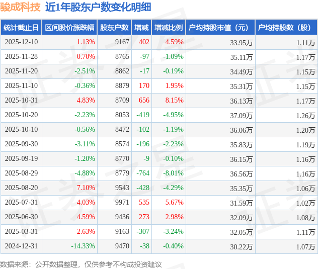从股价来看,2025年11月28日至2025年12月10日,骏成科技区间涨幅为1.13%,在此期间股东户数增加402.0户,增幅为4.59%。
