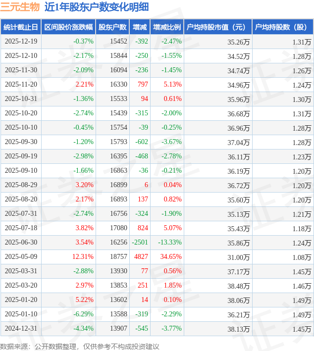 从股价来看,2025年12月10日至2025年12月19日,三元生物区间跌幅为0.37%,在此期间股东户数减少392.0户,减幅为2.47%。