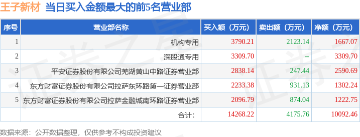 证券之星消息,沪深交易所2025年12月22日公布的交易公开信息显示,王子新材(002735)因日换手率达到20%的前5只证券登上龙虎榜。此次是近5个交易日内第1次上榜。