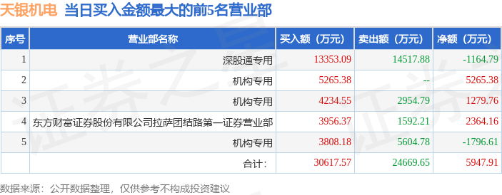 证券之星消息,沪深交易所2025年12月22日公布的交易公开信息显示,天银机电(300342)因日换手率达到30%的前5只证券登上龙虎榜。此次是近5个交易日内第2次上榜。