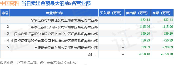 证券之星消息,沪深交易所2025年12月22日公布的交易公开信息显示,中国高科(600730)因有价格涨跌幅限制的日收盘价格跌幅偏离值达到7%的前五只证券登上龙虎榜。此次是近5个交易日内第1次上榜。