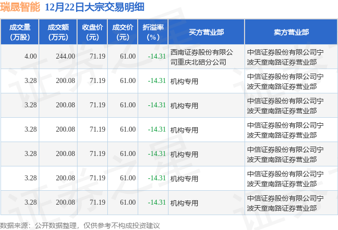 证券之星消息,12月22日瑞晟智能发生大宗交易,交易数据如下: