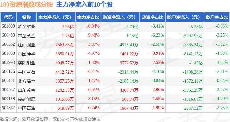 资金流向方面,180资源(000026)指数成份股当日主力资金净流入合计7.88亿元,游资资金净流出合计3.2亿元,散户资金净流出合计4.68亿元。成份股资金流向详情见下表: