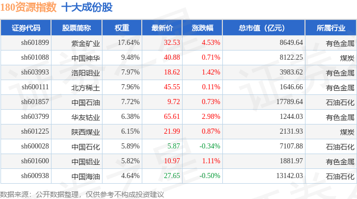 证券之星消息,12月22日,180资源(000026)指数报收于5328.34点,涨1.77%,成交346.11亿元,换手率0.37%。当日该指数成份股中,上涨的有13家,山东黄金以4.56%的涨幅领涨,下跌的有4家,中煤能源以0.69%的跌幅领跌。
