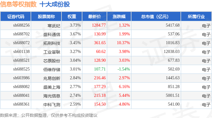 证券之星消息,12月22日,信息等权(000077)指数报收于6012.81点,涨2.5%,成交893.95亿元,换手率1.51%。当日该指数成份股中,上涨的有40家,拓荆科技以10.37%的涨幅领涨,下跌的有7家,龙芯中科以2.6%的跌幅领跌。