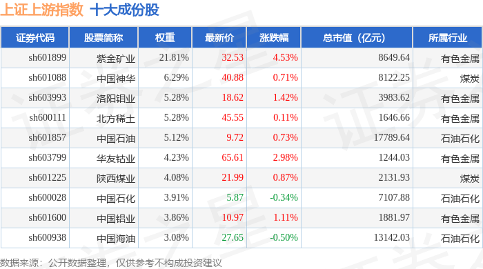 证券之星消息,12月22日,上证上游(000094)指数报收于4378.06点,涨2.11%,成交535.53亿元,换手率0.59%。当日该指数成份股中,上涨的有31家,白银有色以10.04%的涨幅领涨,下跌的有12家,淮北矿业以1.89%的跌幅领跌。