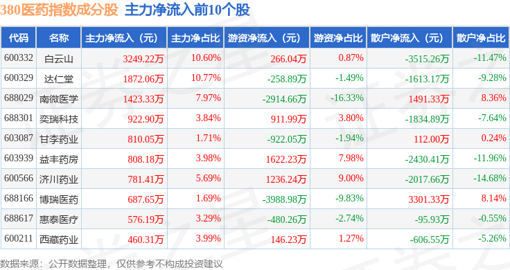 资金流向方面,380医药(000109)指数成份股当日主力资金净流出合计2.11亿元,游资资金净流入合计1852.09万元,散户资金净流入合计1.92亿元。成份股资金流向详情见下表: