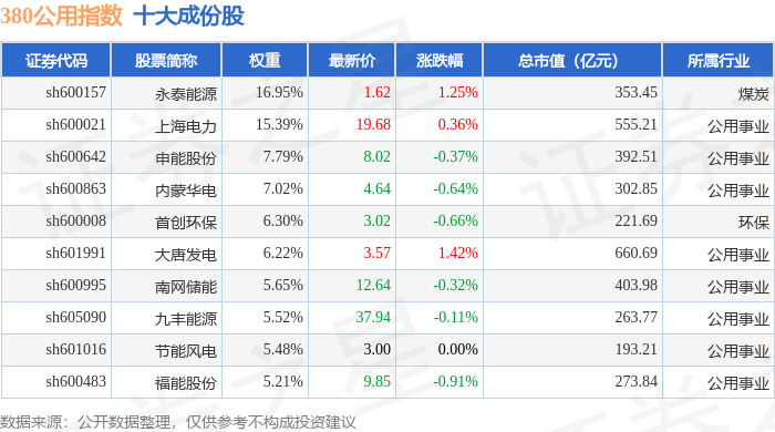 380公用(000113)指数十大成份股详情如下: