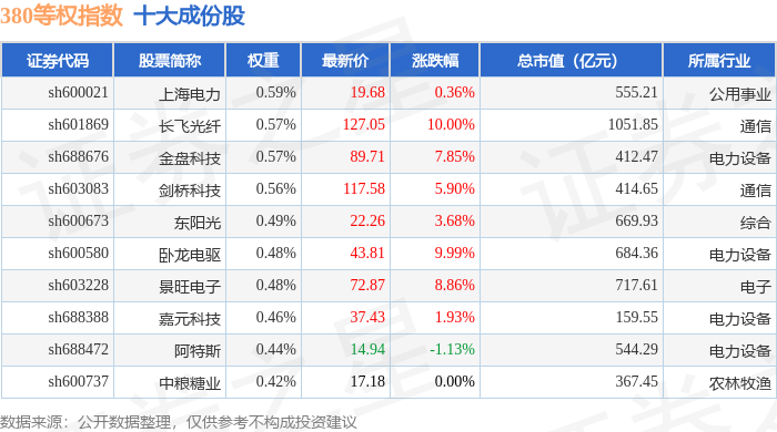 380等权(000115)指数十大成份股详情如下: