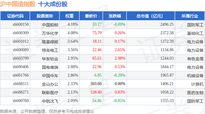 沪中国造(000161)指数十大成份股详情如下: