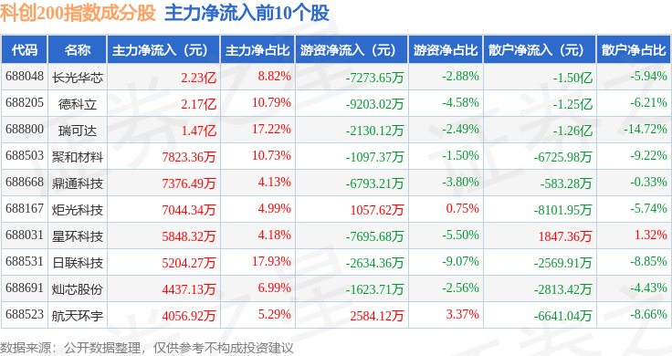 资金流向方面,科创200(000699)指数成份股当日主力资金净流出合计2.15亿元,游资资金净流出合计1339.76万元,散户资金净流入合计2.28亿元。成份股资金流向详情见下表: