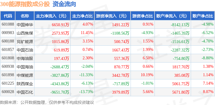 资金流向方面,300能源(000908)指数成份股当日主力资金净流出合计9453.84万元,游资资金净流入合计1.07亿元,散户资金净流出合计1229.92万元。成份股资金流向详情见下表:
