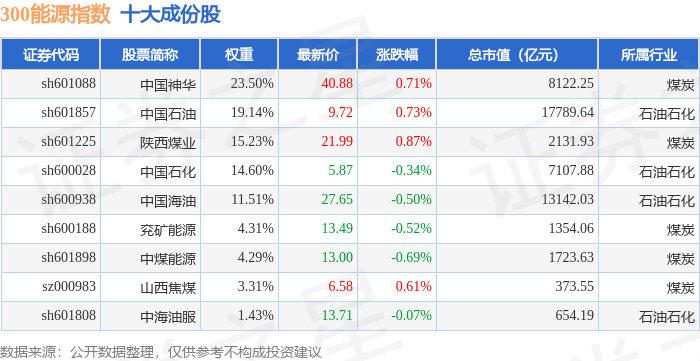 证券之星消息,12月22日,300能源(000908)指数报收于2311.39点,涨0.3%,成交61.75亿元,换手率0.14%。当日该指数成份股中,上涨的有4家,陕西煤业以0.87%的涨幅领涨,下跌的有5家,中煤能源以0.69%的跌幅领跌。