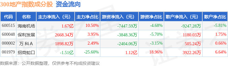 资金流向方面,300地产(000952)指数成份股当日主力资金净流入合计6133.54万元,游资资金净流出合计2493.8万元,散户资金净流出合计3639.75万元。成份股资金流向详情见下表: