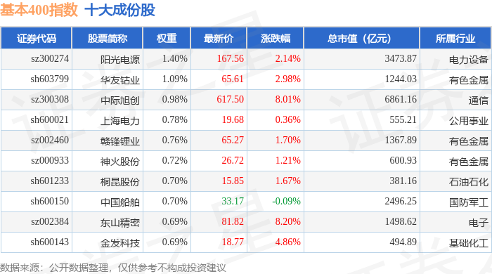 证券之星消息,12月22日,基本400(000966)指数报收于8747.36点,涨1.06%,成交2966.24亿元,换手率1.39%。当日该指数成份股中,上涨的有200家,白银有色以10.04%的涨幅领涨,下跌的有176家,吉比特以4.2%的跌幅领跌。