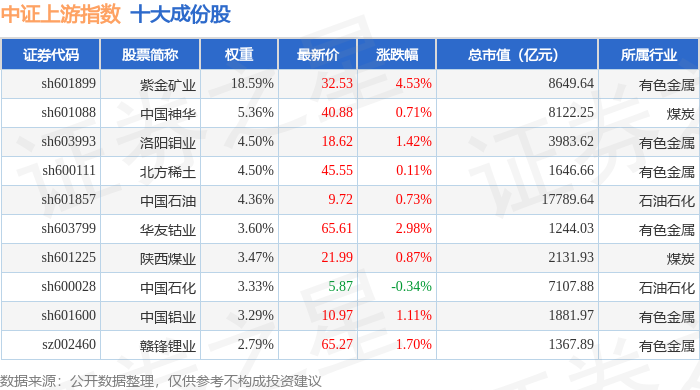 中证上游(000961)指数十大成份股详情如下: