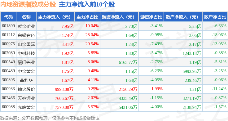 资金流向方面,内地资源(000944)指数成份股当日主力资金净流入合计22.62亿元,游资资金净流出合计12.37亿元,散户资金净流出合计10.25亿元。成份股资金流向详情见下表: