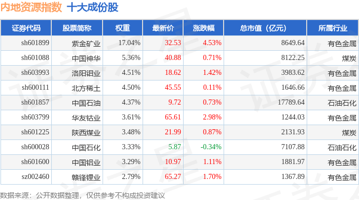 内地资源(000944)指数十大成份股详情如下: