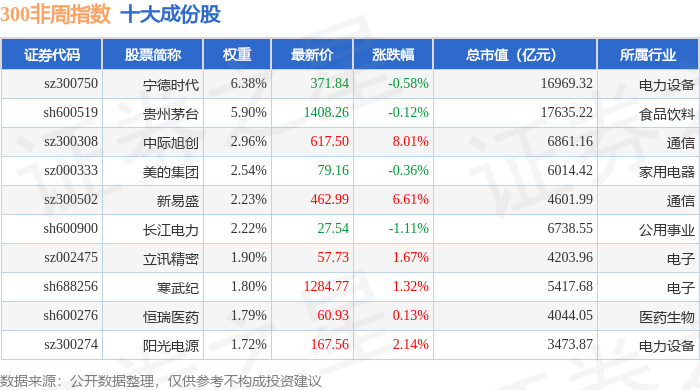 300非周(000969)指数十大成份股详情如下: