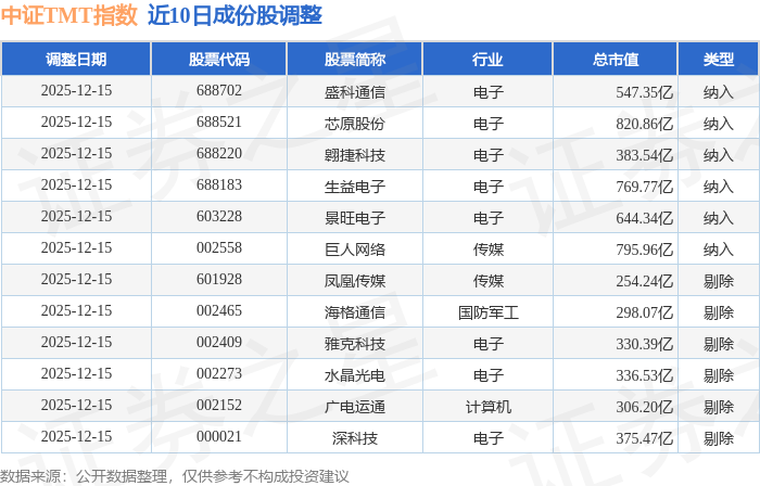 近10日内中证TMT(000998)指数成份股做了调整,新纳入了6只股票,剔除了6只股票。