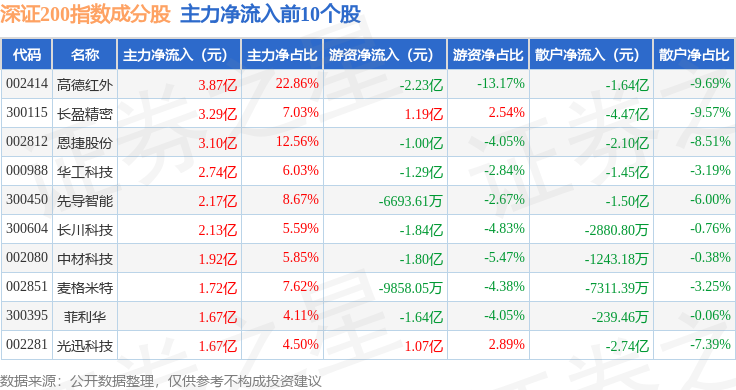 资金流向方面,深证200(399009)指数成份股当日主力资金净流入合计13.65亿元,游资资金净流出合计12.33亿元,散户资金净流出合计1.32亿元。成份股资金流向详情见下表: