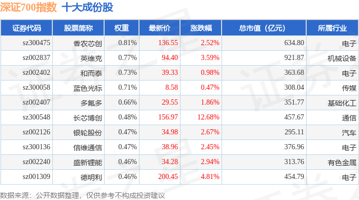 深证700(399010)指数十大成份股详情如下: