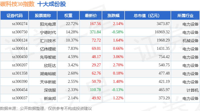 证券之星消息,12月22日,碳科技30(399030)指数报收于4440.55点,涨0.99%,成交450.67亿元,换手率2.3%。当日该指数成份股中,上涨的有22家,晶盛机电以7.64%的涨幅领涨,下跌的有8家,惠城环保以12.43%的跌幅领跌。