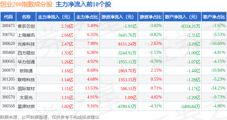 资金流向方面,创业200(399019)指数成份股当日主力资金净流出合计197.44万元,游资资金净流入合计3.27亿元,散户资金净流出合计3.25亿元。成份股资金流向详情见下表: