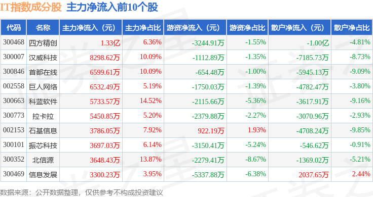 资金流向方面,IT指数(399239)成份股当日主力资金净流出合计23.92亿元,游资资金净流入合计5.12亿元,散户资金净流入合计18.8亿元。成份股资金流向详情见下表: