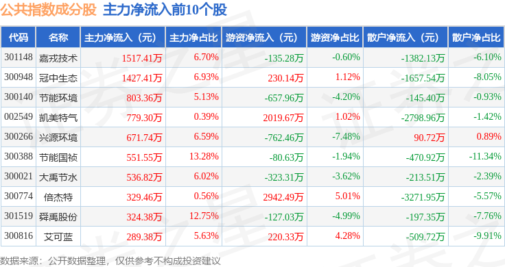 资金流向方面,公共指数(399244)成份股当日主力资金净流出合计3.28亿元,游资资金净流入合计1.31亿元,散户资金净流入合计1.97亿元。成份股资金流向详情见下表: