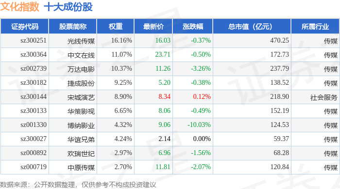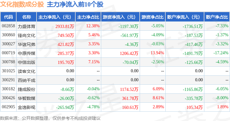 资金流向方面,文化指数(399248)成份股当日主力资金净流出合计4.75亿元,游资资金净流入合计2.09亿元,散户资金净流入合计2.66亿元。成份股资金流向详情见下表: