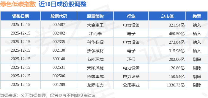 近10日内绿色低碳(399258)指数成份股做了调整,新纳入了4只股票,剔除了4只股票。