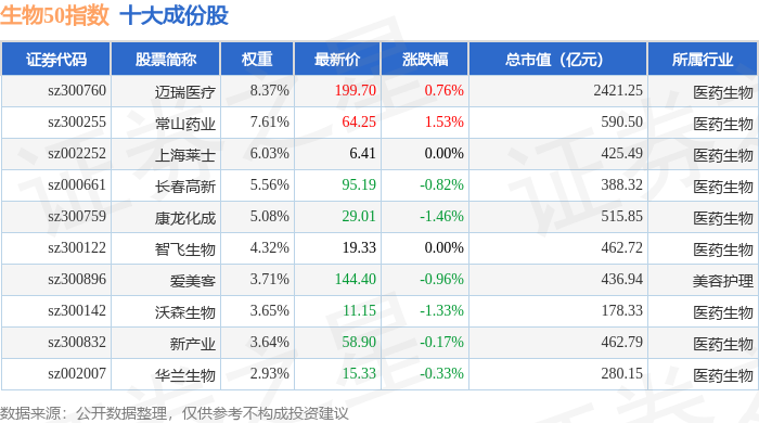 生物50(399280)指数十大成份股详情如下: