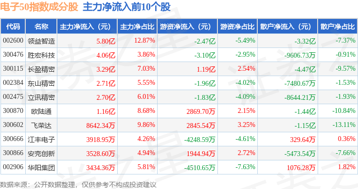 资金流向方面,电子50(399281)指数成份股当日主力资金净流入合计5.77亿元,游资资金净流出合计3.86亿元,散户资金净流出合计1.91亿元。成份股资金流向详情见下表: