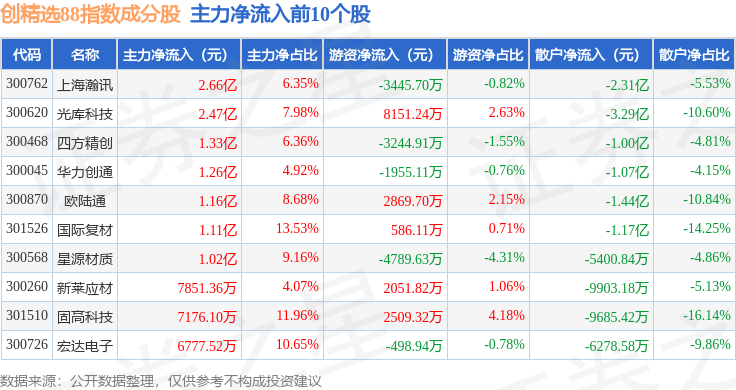资金流向方面,创精选88(399291)指数成份股当日主力资金净流出合计2.58亿元,游资资金净流入合计2.22亿元,散户资金净流入合计3623.66万元。成份股资金流向详情见下表: