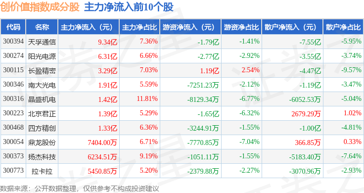 资金流向方面,创价值(399295)指数成份股当日主力资金净流入合计14.64亿元,游资资金净流出合计3.38亿元,散户资金净流出合计11.26亿元。成份股资金流向详情见下表: