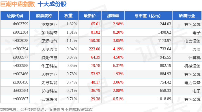 证券之星消息,12月22日,巨潮中盘(399315)指数报收于4679.49点,涨1.63%,成交2815.95亿元,换手率1.73%。当日该指数成份股中,上涨的有179家,拓荆科技以10.37%的涨幅领涨,下跌的有106家,惠城环保以12.43%的跌幅领跌。