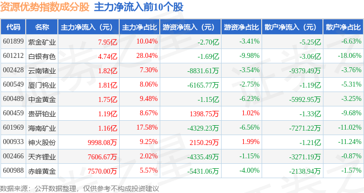 资金流向方面,资源优势(399319)指数成份股当日主力资金净流入合计11.25亿元,游资资金净流出合计4.28亿元,散户资金净流出合计6.97亿元。成份股资金流向详情见下表: