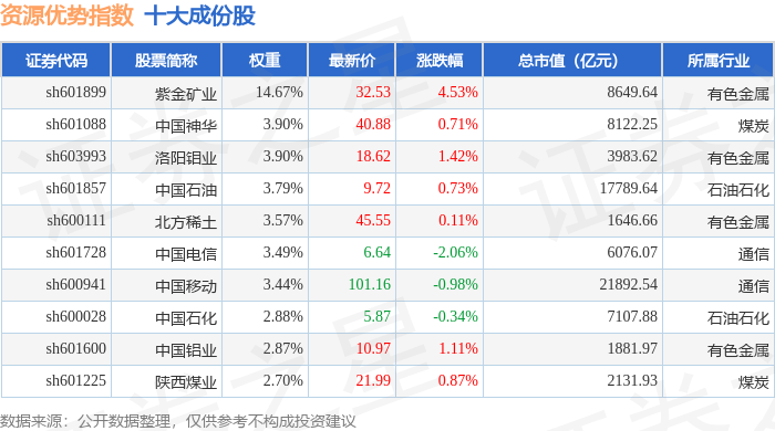 证券之星消息,12月22日,资源优势(399319)指数报收于3229.97点,涨1.79%,成交935.05亿元,换手率0.89%。当日该指数成份股中,上涨的有73家,白银有色以10.04%的涨幅领涨,下跌的有23家,新奥股份以2.76%的跌幅领跌。